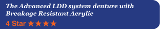 An advanced LDD denture which combines natural life-like teeth with an enhanced break-resistant acrylic base. This system has up to twice the resistance of standard pink plastic bases.