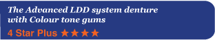 An advanced LDD denture with special natural colouring on the gum work. This is a high specification choice using advanced acrylic to increase resistance and durability. It has twice the resistance of standard pink plastic bases.